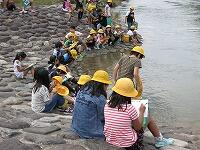 ブルーシートを池に見立てて魚釣りをしてもらいました。