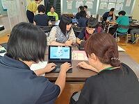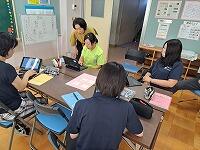 富士電機ITソリューションの方2名を講師にお招きして、「タブレット端末教職員研修」を行いました。Metamoji ClassRoomを使って行うことができる授業や、どんな教材をつくることができるかを研修しました。先生方も分からないときは積極的に挙手をして、操作方法を習得しようと真剣でした。