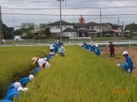 みんな黙々と取り組んでいます。鎌の刃先に気をつけて、刈った稲はコンバインの所に運んで、、、、次々と脱穀されていきます。