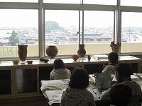 まずはじめに、採掘した土器について学習しました。縄文時代・弥生時代は既習済みでしたので、本物の土器を目の前に、目を輝かせていました。