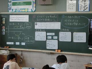 ↓代表的な意見を3つ、黒板に貼り、学級全員に発表