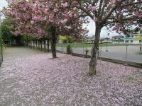 校庭の様子もここのところの暖かさで、咲いている花々の様子ががらりと変わりました。八重桜の下にはピンク色のじゅうたんが敷き詰められたようになっています。