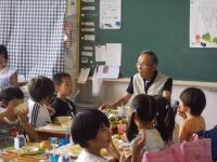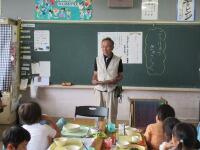 1組・2組それぞれの教室でごあいさつ、お話を聴いたら、元気よく「いただきます