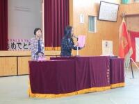 新任式では4名の先生方をお迎えし、6年生の代表児童の『お迎えのことば』で、合戦場小学校