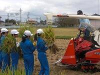 みんな黙々と取り組んでいます。鎌の刃先に気をつけて、刈った稲はコンバインの所に運んで、、、、次々と脱穀されていきます。