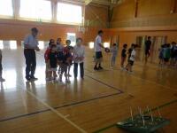 あいさつをしたら、輪投げの仕方を教わって、さっそくやってみましょう。