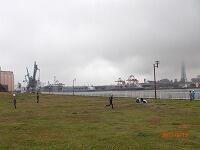 欠席なし、全員元気にそろって学校を出発しました。まずは港公園で昼食です。対岸には工業地帯があり、大きなクレーンや煙突が見えました。