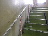 この夏休みを使って、合戦場小学校では西階段の下り方向にてすりを設置する工事が行われました。これまでも、登り方向には手すりが設置されていましたが、右側通行時の下りの安心・安全のために、1日・2日の2日間の工事で、きれいな手すりが完成しました。