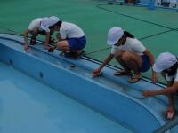 と、いろいろな教科でがんばる子どもたちの様子を見ていただきました。プールサイドから、4階の音楽室・理科室まで、特別教室での授業もありました。