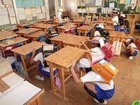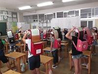 ランドセルを背負って、頭を守ります。