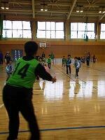 試合開始です。大人のボールから逃げ惑う子どもたち。