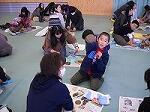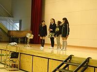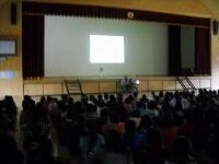 図書委員会による読書集会が行われました。たくさん本を借りた4人にお勧めの本を紹介してもらいました。後半は、スクリーンに映し出された本を見せながら、図書委員会の児童が読み聞かせを行いました。