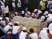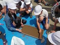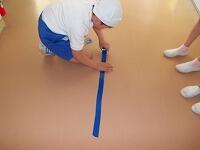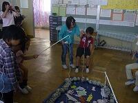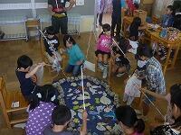 ブルーシートを池に見立てて魚釣りをしてもらいました。