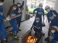 二日目の杉板焼き。自分たちで火を起こし、杉板を焼いてから一生懸命磨いていました。