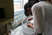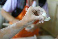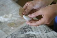 勾玉作りに挑戦。四角い石を丸く削るのに悪戦苦闘しながらも、世界で