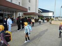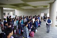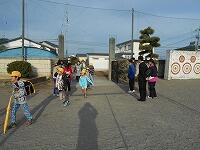 中学生が小学校に来て一緒にあいさつしてくれています。