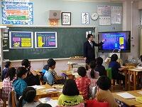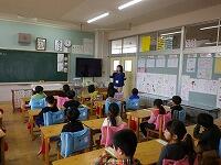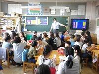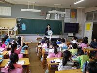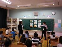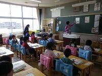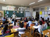 合戦場小学校のALTの先生は、今年、ビシャカ・デイ先生になりました。今日は2年生がビシャカ先生と一緒に「外国語活動」の授業を行いました。体を動かしながら英語の歌を歌ったり、ビシャカ先生の国「インド」のお話を聞いたりしました。