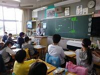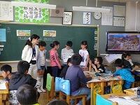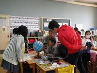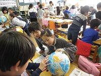 5年2組の教室では、社会科「日本の国土と人々のくらし」の学習で、班ごとに地球儀を使って、日本の国土の位置を調べていました。日本の位置を通る経線、緯線、そして赤道にテープを貼って、確認しています。日本の国土の位置がわかりましたね。
