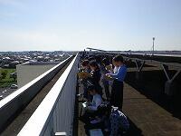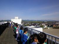 1時間目に3年生のみなさんは、社会科の「わたしたちまちのようす」の学習で屋上に上がり、東・西・南・北の方向に見えるものを観察しました。