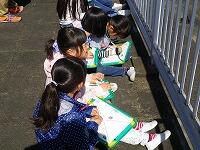 探検バックを手に、ワークシートに建物シールを貼ったり、気づいたことを書き込んだりしました。よい天気に恵まれ、遠くまでよく見渡すことができました。