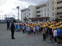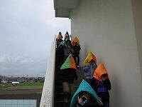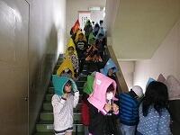 1・2・4・5年生は東側階段を使って避難しました。ハンカチで口と鼻を押さえて、「お・か・し・も」を守って、静かに安全に避難することができました。