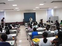 そして、海浜自然の家に到着、オリエンテーション・入所式を行いました。「よろしくお願いします。」食堂も広くて、おいしい夕食でした。