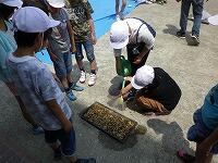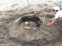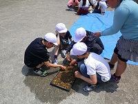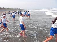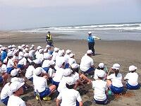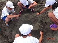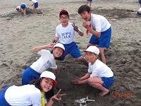 午後の活動は『砂の造形・砂浜活動』です。まずは、波打ち際で海を体感しました。「冷たい!!」「波の力が強い」という感想が聞こえてきました。その後、潮汲みリレーを行いました。最後は、班で協力して「動物」や「お城」などを砂で作り上げました。拾い集めた木ぎれや貝がらを工夫して使う班もありました。