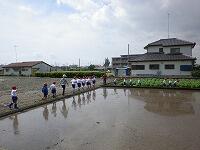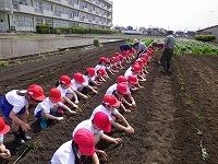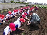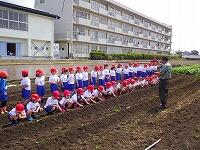 1年生は2時間目に、学校南側の川上さんの畑で、さつまいもの苗を植える体験をさせていただきました。