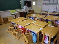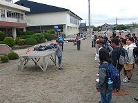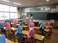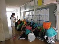 「竜巻注意報・発令」の放送が流れたら、防災頭巾をかぶって先生の指示をしっかりと聞きます。「竜巻発生・避難」の指示で、避難場所(壁に囲まれているところ・トイレ・教室の机を寄せてその下など)に黙って素早く移動しました。