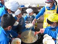 できあがった大鍋力うどんを一口、「おいし~!!」という言葉が子どもたちから出てきました。鍋がからっぽになるまで食べた班もありました。