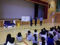 『防犯教室』では、①相手と距離をとる ②防犯ブザーの活用 ③大きな声で ④いざという時はランドセルを置いて、等のポイントを、警察スクールサポーターの船渡川さんと代表児童のロールプレイで教えていただきました。