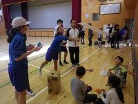 投げ方を教わって、とても上手になりました。ALTのビシャカ先生も一緒に輪投げを楽しみました。