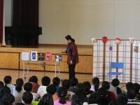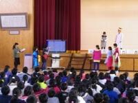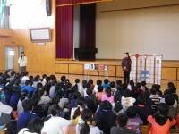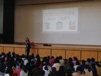 今日の集会タイムは「校長先生の話」。まず、「マスター検定」をがんばっているみなさんの紹介しました。3年生の検定課題の作者でもある金子みすゞさんの『こだまでしょうか』の詩をもとに、子どもたちに「こだましたいことば」について、考えてもらいました。