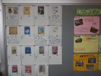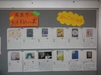 校内読書週間の取組④は、「先生方のおすすめの本」紹介コーナーです。図書室前の廊下に、合戦場小学校の全教職員がおすすめする本の紹介カードとその本が展示されています。