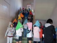 今日の避難訓練は、『地震が発生し、その後家庭科室から出火』という想定で、集会タイムに予告なし