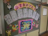 6年教室の廊下壁面には、1年生からのメッセージが掲示されています。たくさんたくさんお世話になった6年生への「ありがとう。」の声が聞こえてきそうな、似顔絵掲示です。
