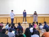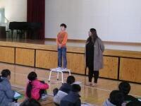 』が上演。1年生の笑い声に包まれました。さあ、一緒に歌いましょう「も~も太郎さん♪、桃太郎さん、お腰につけた~♫ きびだんご~♪」(ここだけ、日本語です)