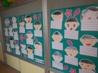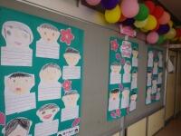 6年教室の廊下壁面には、1年生からのメッセージが掲示されています。たくさんたくさんお世話になった6年生への「ありがとう。」の声が聞こえてきそうな、似顔絵掲示です。