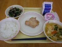 メニュー』で、「ごはん・牛乳・鶏肉のねぎ味噌焼き・磯香あえ・にら玉汁・お祝い