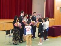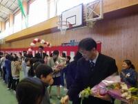 平成29年度最終日、合戦場小学校を離任される先生方とのお別れの式、離任式です。転任者の紹介、代表児童の『お別れのことば』に続いて、先生方に花束をお渡ししました。