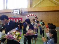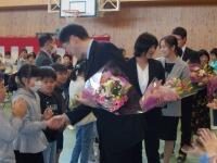 転任される先生方お一人お一人からお話しいただき、花のアーチをくぐってのお見送りです。卒業した6年生も、登校して式に参加しました。大きな拍手でお見送りしました。