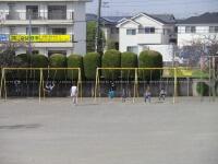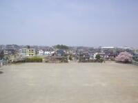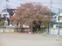 合戦場小学校の校庭には今、校門をはさんで西側滑り台近くに淡く白い桜、東側校鉄棒脇にピンクがかった桜、紅白の桜が見事にそろって咲いています。