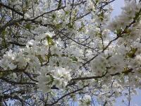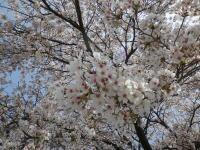 近くに寄ってみると、花の中央部分の色の違いで、木全体の色の印象が変わっていました。ピンク桜は、今日は風に吹かれて『花吹雪』でした。紅白の桜