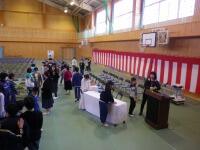 体育館はいすを並べ替えて、鉢花を並べて、看板や国旗を取り付けました。