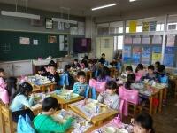 、とてもおいしかったです。紅白ゼリーにはさくらの形のクリームがのっていました。お赤飯1年生 がんばっています!
