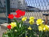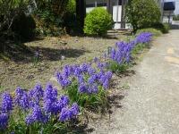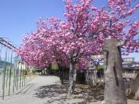 校庭南側の八重桜の木の下には、ピンク色のじゅうたんがひいてあるようです。