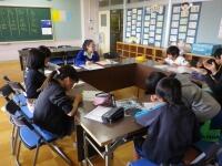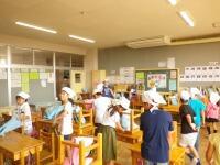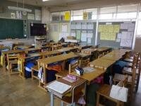 教室ではそろそろ清掃終了の時刻。2~6年生が協力して、机をそろえて、いすを下ろしています。