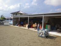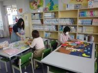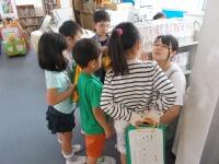 4階の図書室では田村先生、理科室では川島先生とごあいさつやお話をして、シールを貼ってもらいました。プールサイドにも行ってみました。