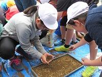 をしています。先生と一緒に、バケツや一輪車に拾った小石を集めます。