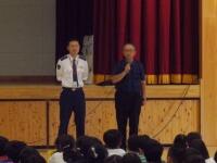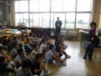 体育館では、警察スクールサポーターの船渡川さんに自分を守るために大切なことをDVDや資料で説明をしていただきました。大声を出すこと、防犯ベルを鳴らすこと、などもロールプレイを通して学びました。平川駐在所の小島さんにも、避難の時に大切なことを教えていただきました。